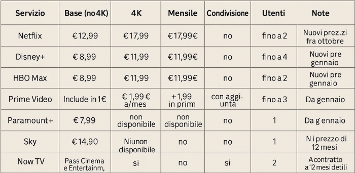 Negli ultimi due anni i prezzi sono aumentati quasi ovunque. Disney+, Netflix, Prime Video, NOW, e perfino HBO Max (che arriverà in Italia nel 2026) hanno introdotto nuovi piani, spesso più costosi. Le differenze principali riguardano: